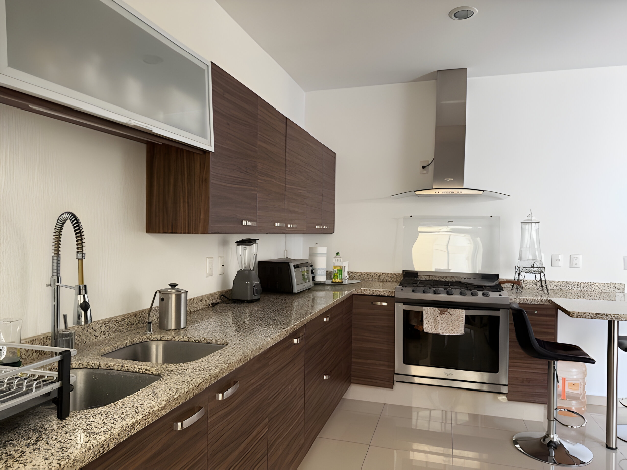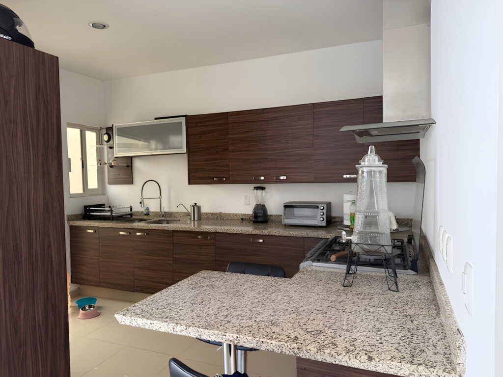 🍽️ Cocina equipada con barra desayunadora y cubierta de granito